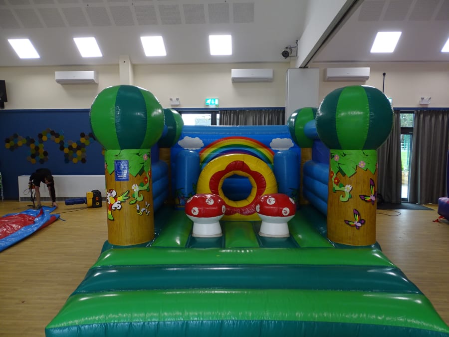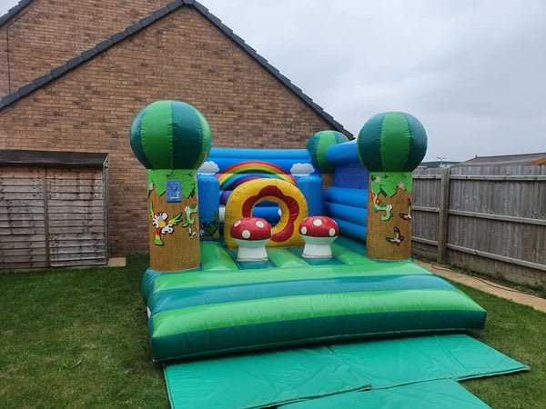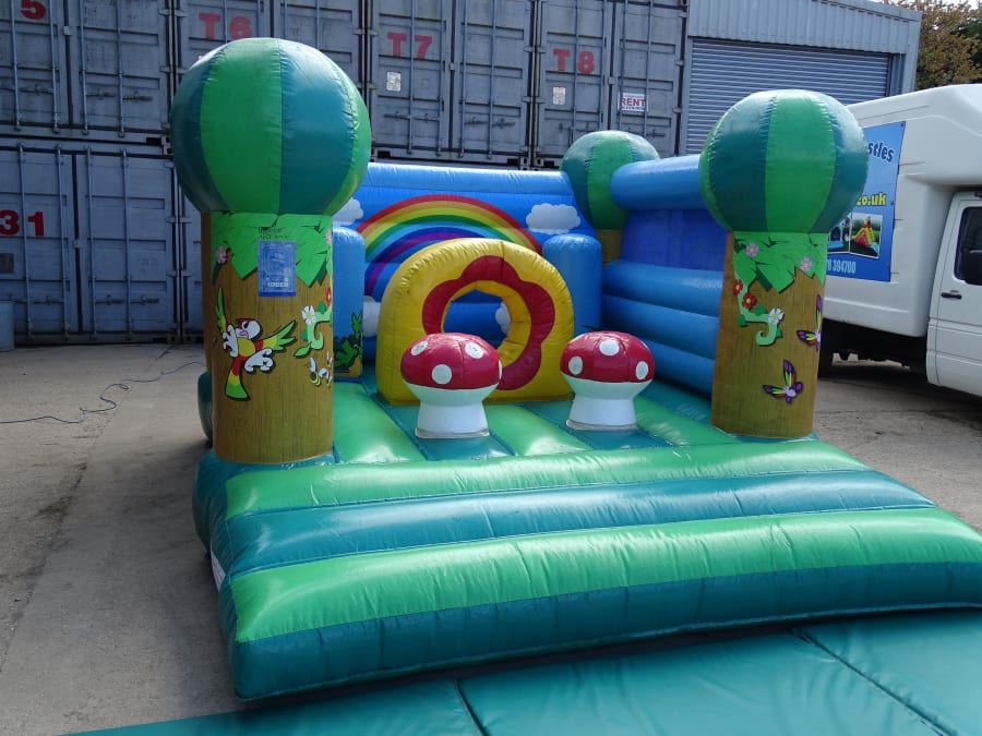 Magic Forest with Rainbow..A perfect garden hire for children . Size 14ft deep x 12 ft wide . A bouncy castle with pop up on the bed for extra fun. Lovely activity bouncy castle. High walled for extra safety ..very colourful with rainbow art work.