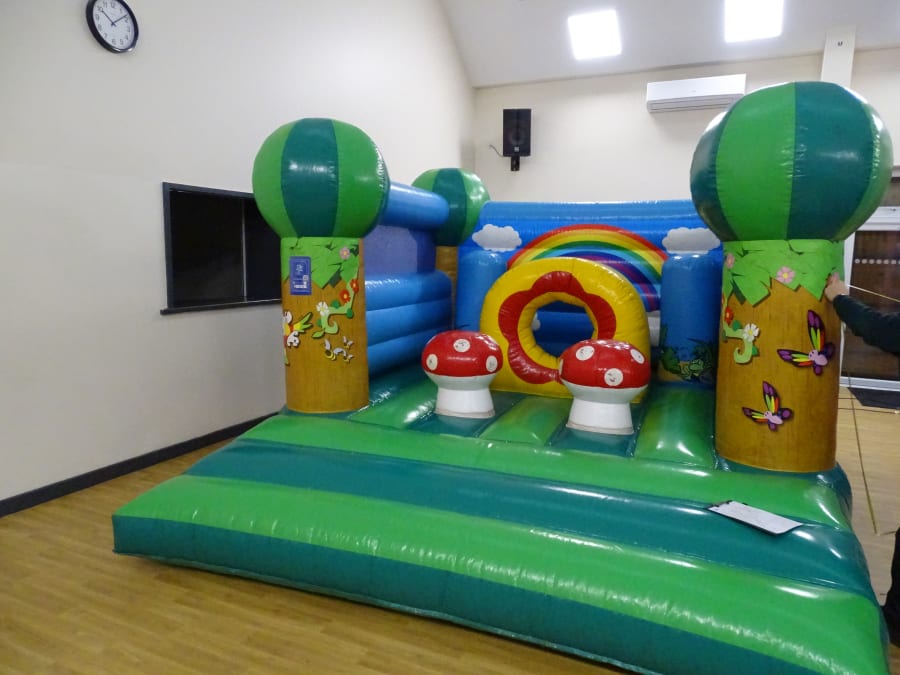 A perfect garden hire for children . Size 14ft deep x 12 ft wide . A bouncy castle with pop up on the bed for extra fun. Lovely activity bouncy castle. High walled for extra safety ..very colourful with rainbow art work.