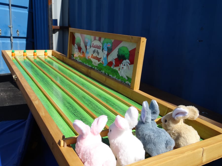 Welcome to Rabbit Racing ...Watch the rabbits hope to it ...Pick your favourite rabbit to win ..watch the bunnies hop down the track to the finish line. Great fun for all ages .Bet on your racing Rabbit ..Big 8ft Long track ..4 lanes ..racing to the carrot ant the end. See video attached .