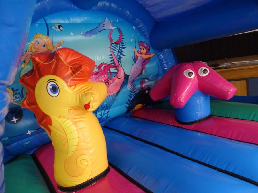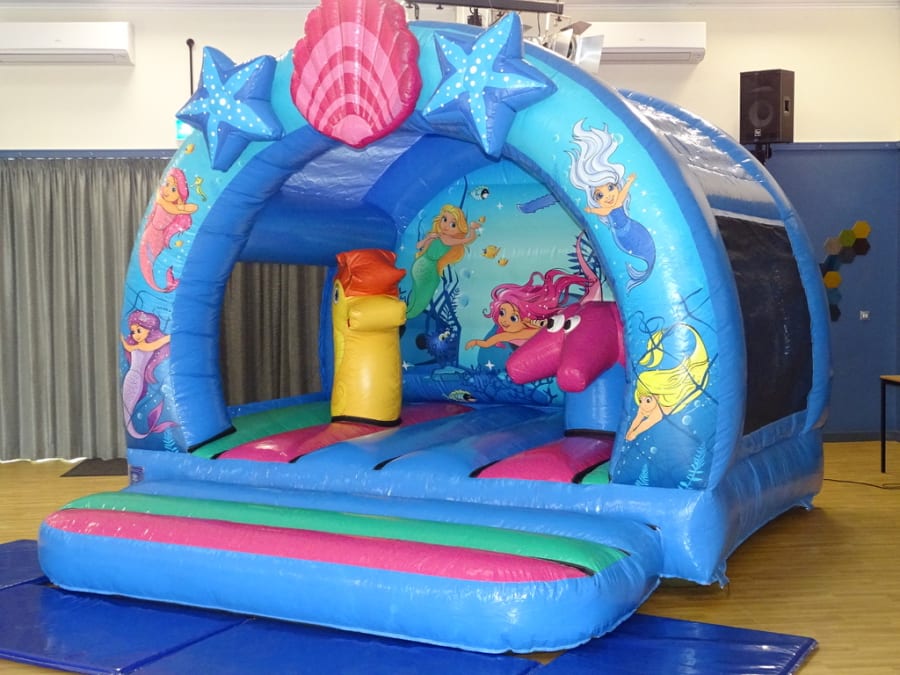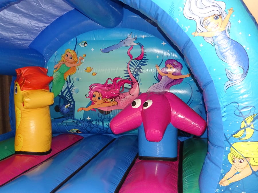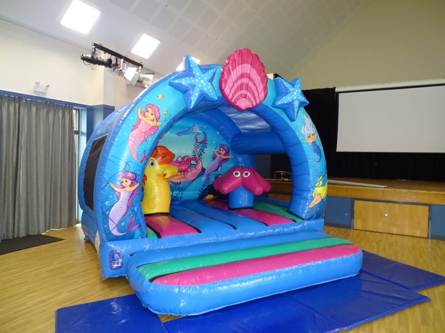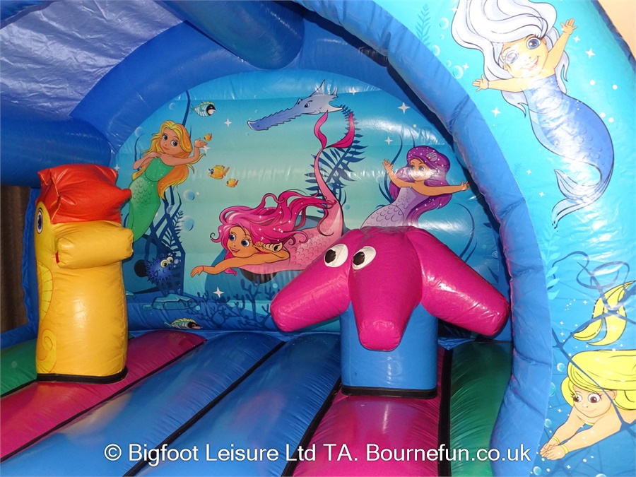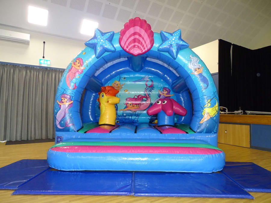 Mermaid Activity Bouncer 3D..13FT X 13FT X 12FT High ..A fantastic bouncy castle with great artwork. Its a great bouncy castle with rounded corners , netted sides and 3- dimensional biff- bashes on the bouncy bed of this castle. On top of the arch we also have a stunning 3D elements to provide an even greater wow factor! This castle can be hire indoor venue *Please check size before booking your hire on line. as well as outdoor garden party hire / BBQ / Wedding /Birthday.. This being a good size of castle can take up to 15 kids uptown the age of 12 years. Sure to be a great party ..Booking early is advisable!