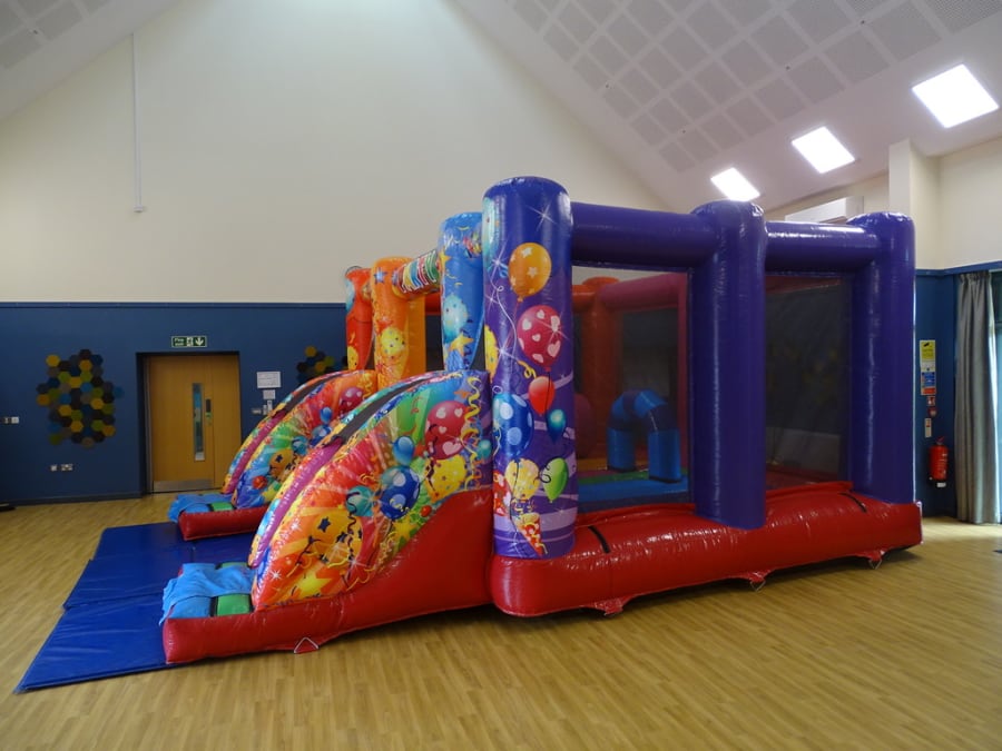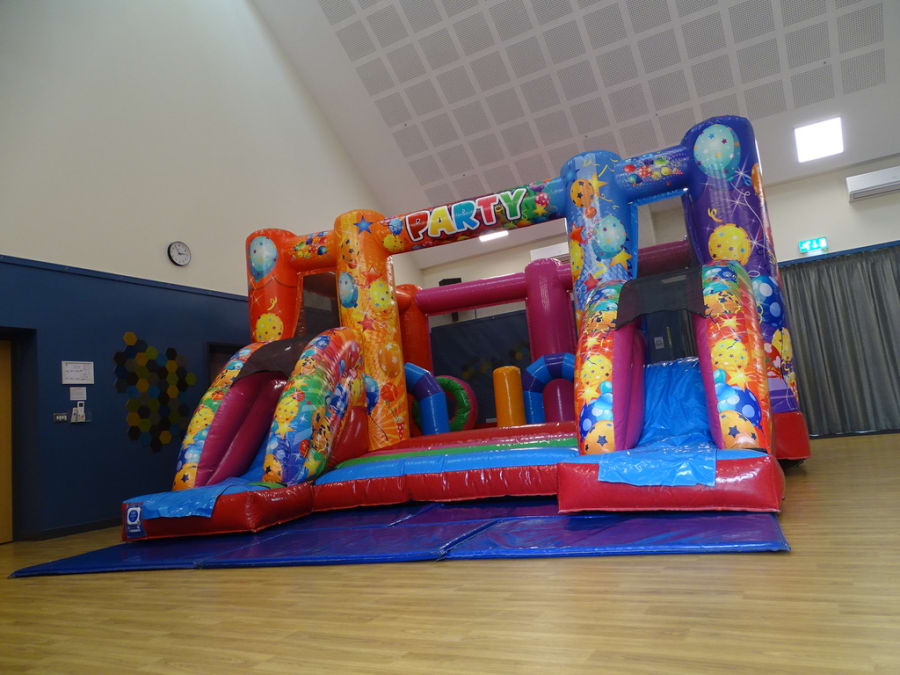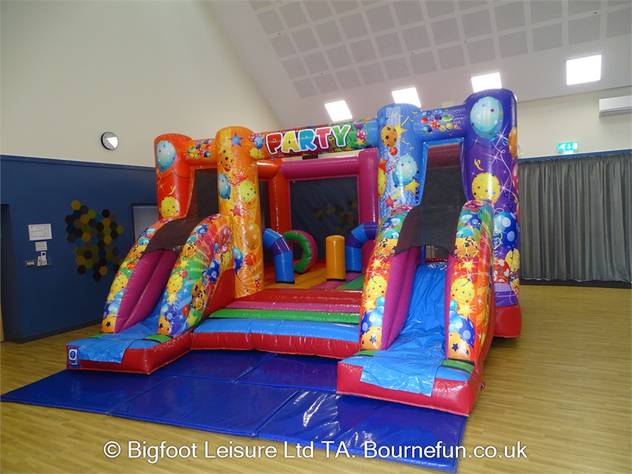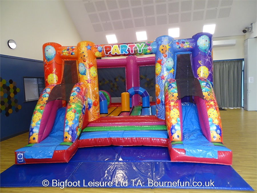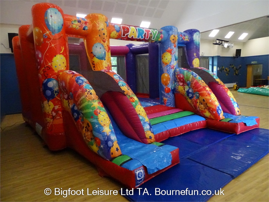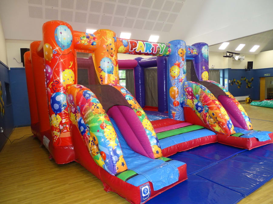 Welcome to the PARTY MULTI COLOUR DOUBLE SLIDE ...Brand new in stock ...A mega fun bouncy castle with two slides attached ..Double the fun ...A large bouncing area with Bif Bash and play arches .. Netted sizes for easy viewing *keeping fair play with the kids ...This is a really good size for a great party hire ...