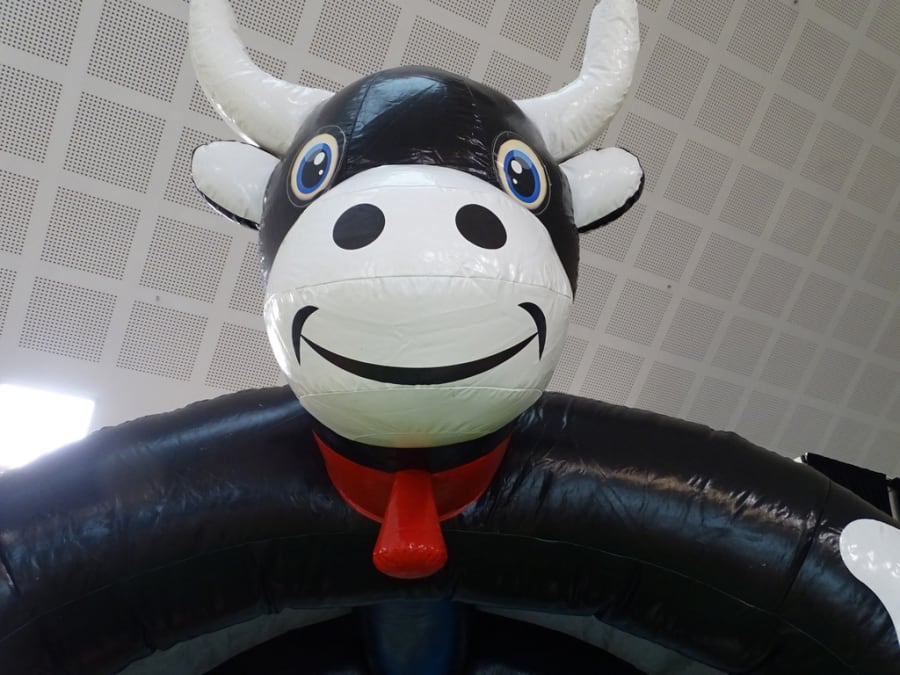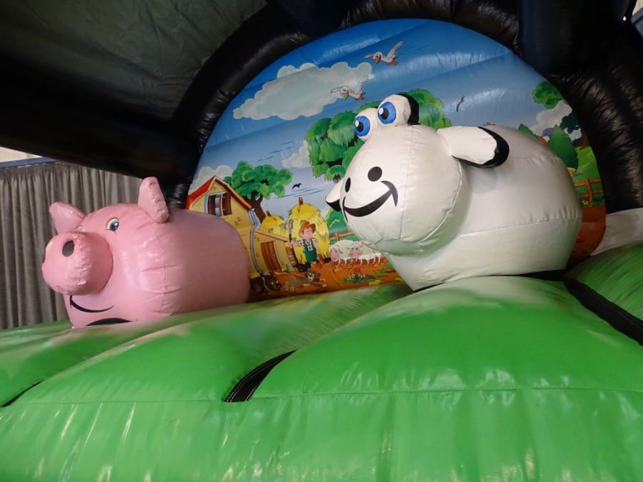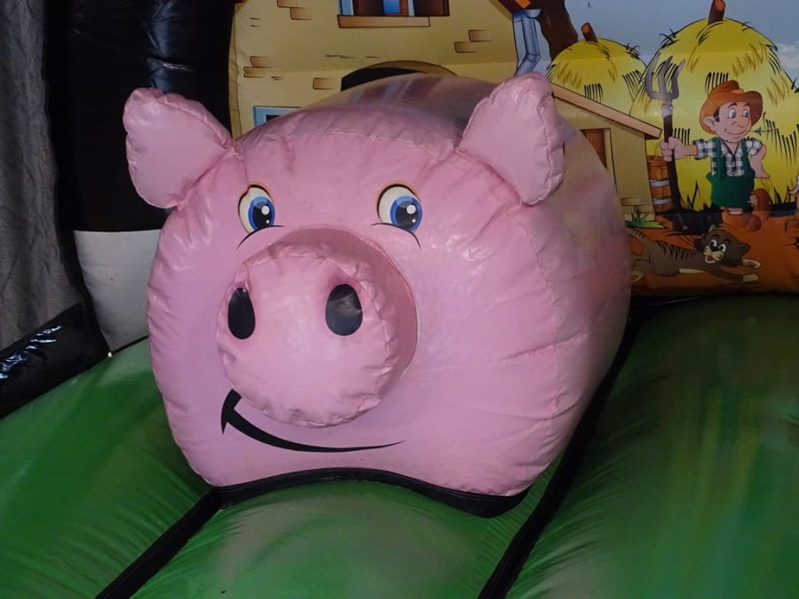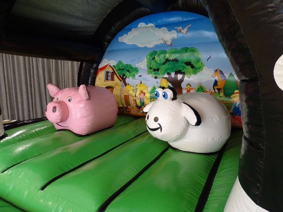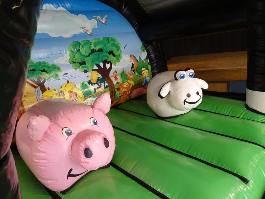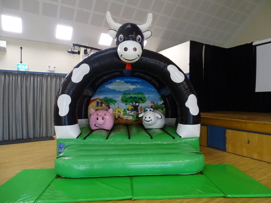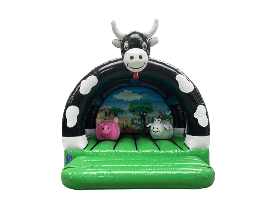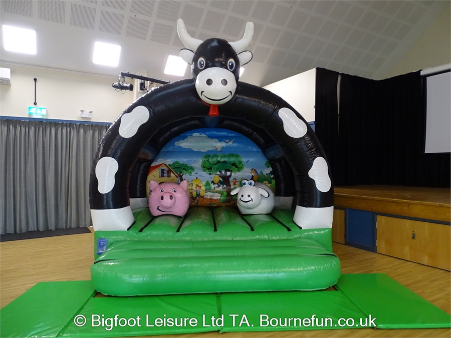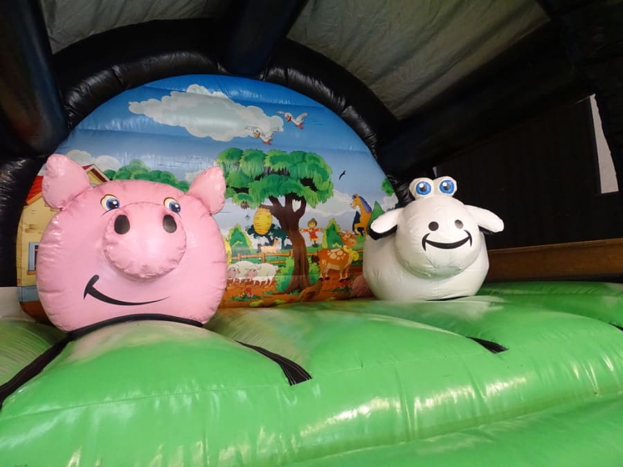 Welcome to "Farm Yard Play Barn "..Brand new in stock. A lovely castle with a 3D cows front artwork front ..Two pop ups.. a Fat pink pig with Shaun the sheep as good company. Great back ground art work inside. Comes with a fitted shower cover *just in case of showers. very much suitable for outdoor garden hire or indoor village hall venue hire.